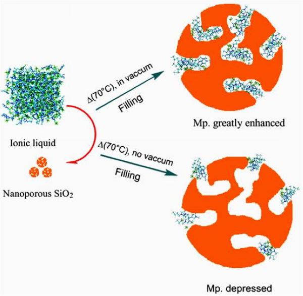离子液体是完全由阴阳离子组成的一类特殊盐类,由于离子液体独特的物理化学性质,如几乎不挥发、不可燃、热稳定性好等特性,使得离子液体在合成、分离和催化等许多领域,特别在表面催化、燃料电池中的电解质和导电复合材料方面都有着广泛用途,而应用中会涉及离子液体受限于纳米空间,其相变的研究是该领域研究的热点。研究发现不同气氛下下离子液体在多孔SiO2(平均孔径4nm)孔道中填充后,其物化性质表现出巨大差异。在高真空条件下,离子液体填充SiO2后的熔点显著升高,升高约140C,这与其他文献报道的结果不同,大多数文献报道离子液体填充在纳米空间其熔点下降。分析认为采用高真空填充离子液体,可以使离子液体几乎填充满整个孔道(如图1上图),体系只有固液相界面,纳米尺度下强烈的界面诱导作用和纳米限域效应导致离子液体呈现类晶体性质,高分辨TEM图也显示填充后离子液体均匀分散在孔道内(图2c)。而常压条件下填充时,因孔道内压缩气体的存在,离子液体只能吸附在孔道入口处或者部分进入孔道内部,体系形成复杂的气-液-固三项界面,离子液体分子排列比较松散,导致离子液体熔点下降。