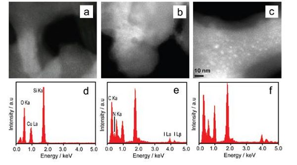 图2.高分辨STEM图及EDX谱比较:SiO2 (a, d), 离子液体负载SiO2 (b, e), 离子液体填充iO2(c, f)