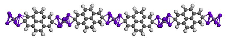上海应用物理研究所的高嶷研究员与美国内布拉斯加大学林肯分校的曾晓成教授等合作,系统研究了第一行的副族元素以及大部分主族元素形成高配位碳体系的可能性,最后发现只有钛原子能够和碳形成七配位的超配位碳分子体系[CTi72+](图1),这是目前为止理论上发现的最大配位且稳定的碳分子体系。通过计算模拟进行蒙特卡洛的全局能量搜索,他们发现该体系比其异构体能量更低,且该体系为D5h对称性,有较大的能带间隙。该体系的30个价电子的双金字塔结构也与Wade规则非常吻合,从而进一步证明了该体系的稳定性。由于该体系是一个二价阳离子,理论计算证明了它可以通过配位2个阴离子形成非常稳定的中性体系并在室温下稳定存在。作者还进一步从理论上探讨了利用该超配位碳设计一维纳米线的可能性(图2)。英国伦敦皇家学院的Henry Rzepa教授评论说:“New ideas are as likely to come from computation as from experiment, and there is a vibrant, fruitful, interplay between these, The CTi72+ system here is a wonderful example of how this process happens. The strength of ideas such is that it inspires experimental chemists to go make it in the lab.”