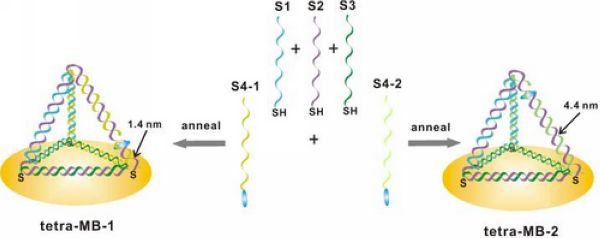 研究DNA双螺旋结构介导的界面电荷传递的关键技术是获得一个有序的界面DNA单分子层。然而,通过巯基修饰的双链DNA在金表面自组装这一常规技术很难保证获得一个理想的单分子层。之前的研究表明,致密的DNA单分子层内存在着DNA链之间的缠绕和局域聚集;而稀疏的DNA单分子层则容易发生DNA链的弯曲倒伏,不能保证组装的DNA双链能够有序站立在金表面。因此尽管已有多项工作获得了DNA双螺旋结构介导界面电荷耦合传递的初步证据, DNA单分子层内的无序性仍然给这些工作的结论带来了不确定性。为了解决这一矛盾,在樊春海研究员和颜颢教授的指导下,鲁娜和裴昊博士等科研人员利用实验室发展的界面三维DNA纳米结构框架这一独特体系对电荷传递进行了研究。之前的研究表明,DNA四面体结构具有很好的机械刚性和结构稳定性,通过底部三个顶点的修饰巯基可以牢固锚定在金电极表面,形成有序的界面单分子层(Adv. Mater., 2010, 22, 4754),且其框架结构限定了DNA双链与电极表面的取向,克服了常规DNA单分子层研究中存在的局域聚集和弯曲倒伏等问题,为DNA单分子层的电荷传递研究提供了新的研究方法。