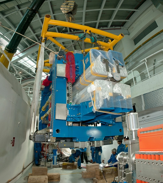由中科院物理研究所在上海光源上建设的超高分辨宽能段光电子实验系统将采用椭圆极化波荡器产生的包括线极化、圆极化、以及各种椭圆极化的同步辐射光,光子能量覆盖范围20eV-2000eV。该DEPU由两台总长约5米,周期长度分别是58毫米和148毫米的APPLE-II型可变椭圆极化波荡器组成,两台波荡器并列设置共用一个机架,机架整体横向移动以实现两台波荡器的切换。该波荡器是国际上首台通过横向切换实现高通量,覆盖高、低能光子范围的椭圆极化波荡器,具有磁体排列间磁作用力变化范围大、结构复杂、空间受限、整机尺寸庞大等特点。上海应用物理所在上海光源插入件研制技术和条件基础上,经过方案设计、工程设计与国际评审、元件制造和采购、设备总装、磁场测量和垫补等环节,解决了大梁纵向传动稳定性、磁场测量空间受限等问题,于2013年1月底完成了DEPU研制,并开始现场安装。在完成补偿线圈现场绕制、轨道前馈系统和工作点前馈系统安装与调试基础上,预计于2013年春开始束流调试,为“梦之线”的束线及实验站调试及试运行做好准备。(机械工程部 供稿)