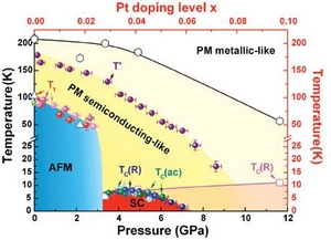 该项研究的高压X-ray衍射测试均在上海光源BL15U1线站上完成。实验中首先将单晶样品磨碎后置入金刚石对顶砧中,然后在1-14GPa的不同压力条件下进行原位测试。衍射图谱表明,不同压力下样品均为三斜晶系。Ca10(Pt3As8)(Fe2As2)5常压下是一种反铁磁半导体,本研究发现压力在有效抑制样品中的反铁磁长程序后,导致了超导电性的出现。对比温度-压力电子相图和Fe位掺Pt的温度-掺杂电子相图,发现两者之间有明显的相似和不同。在4.1GPa以内,压力和电子掺杂对体系的反铁磁转变温度、超导转变温度的影响十分相似,然而在更高压力下,压力对该系统的 TC随压力变化关系与电子掺杂的变化关系完全不同,这表明两种途径诱发超导电性的直接起因是不同的。这些实验结果为进一步深入开展对铁基超导体的实验和理论研究提供了重要的信息。(材料与能源部 供稿)