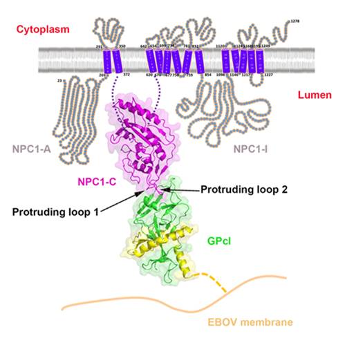 埃博拉病毒是一类囊膜病毒,其对宿主的入侵可以分成两个重要步骤,首先是病毒粘附到宿主细胞膜表面,然后是病毒通过细胞内吞进入细胞内部,形成内吞体,在内吞体内,病毒发生膜融合过程,释放自身遗传物质。