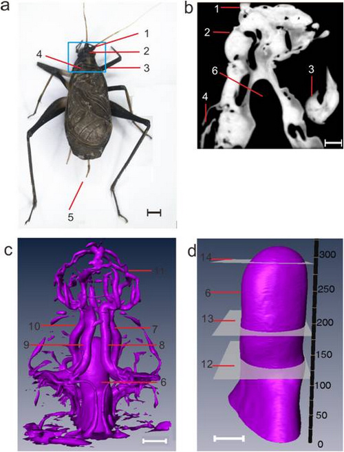 昆虫种类繁多、形态各异,属于无脊椎动物中的节肢动物,是地球上数量最多的动物群体,占据所有生物种类(包括细菌、真菌、病毒)的一半以上。如此众多的种类却拥有类似的呼吸系统结构:由外胚层内陷形成的管状气管系统。昆虫通过这一管状系统直接将氧气输送给需氧组织、器官或细胞。根据所处位置不同,管状系统可以细分为:气管(遍布全身的管状结构)、气门(气管在身体两侧的开口)和气囊(气管的膨大部分)。气囊一直被认为是昆虫内部气体交换的“风箱”,在昆虫呼吸过程中起到发动机的作用。长期以来,由于缺乏昆虫活体三维原位观测(in-vivo)的手段,通常假定其收缩是各项同性的。