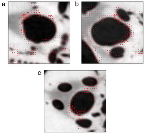 25秒时,气囊第110,180和290层切片横向变化速度场。三幅图像中间最大的黑色区域是气囊的切片。红色箭头代表运动方向,长度代表变化速度。