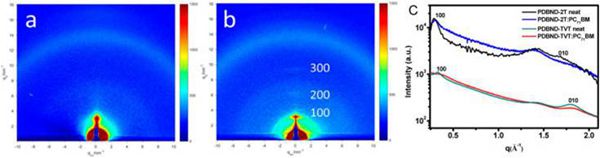 图2 新型有机太阳能电池宽带隙材料GIWAXS结果