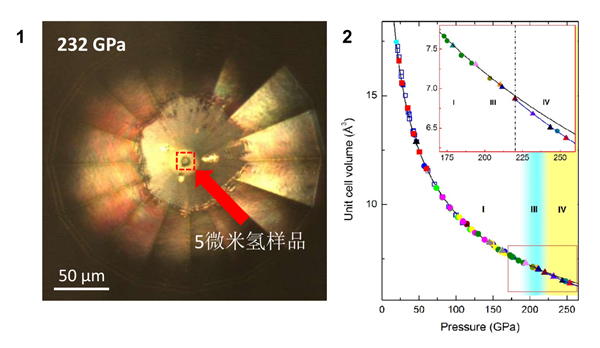 1. 高压氢样品显微照片 2. 同步辐射技术测量的氢状态方程
