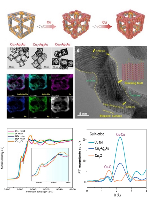 合作研究团队精心设计了具有高度应变和扭曲Cu相的三元Cu3-Ag3Au纳米框架 (Cu3-Ag3Au NFs),用以精确引导迈向C2+产物的两个关键步骤,即“CO2→*CO”和“2*CO→*OCCO”。其中Ag3Au纳米框架能高效的催化CO2到CO,其选择性高达97%,而高应变Cu相在C-C偶联中非常有效。该工作首先开发了一种在水相体系中快速合成结构高度均一、缺陷丰富的Ag3Au纳米框架的方法。接着,利用Ag3Au上的缺陷作为成核位点,外延生长了高应变Cu相。在这一过程中,上海光源硬X射线通用谱学线站(BL11B)在表征材料的电子结构等方面起到了重要的作用。通过Cu的K边X射线近边吸收谱(XANES)测试观察到了Cu3-Ag3Au NFs中Cu的价态位于Cu0和Cu+之间,且从傅立叶变换的Cu的K边X射线扩展吸收谱(EXAFS)中观察到Cu3-Ag3Au NFs中存在Cu-Cu的配位而不存在Cu-O的配位,表明样品中不存在氧化铜。进一步实验证明了样品中Cu的价态受到Ag/Au基底的影响,基底中Ag/Au损失的d轨道电子会被Cu的s-p杂化轨道电子过度补偿,导致Cu的价态处于Cu0和Cu+之间。通过原位XANES来监测Cu的电子结构随电催化时间的变化情况,结果发现在整个测试期间,即使在高度还原环境下Cu3-Ag3Au NFs中仍存在结构诱导的Cud+(0<d<1)。Cud+(0<d<1)的存在有利于在CO2RR过程中结合中间产物,并有助于再适度过电位下促进CO二聚体形成C2H4。