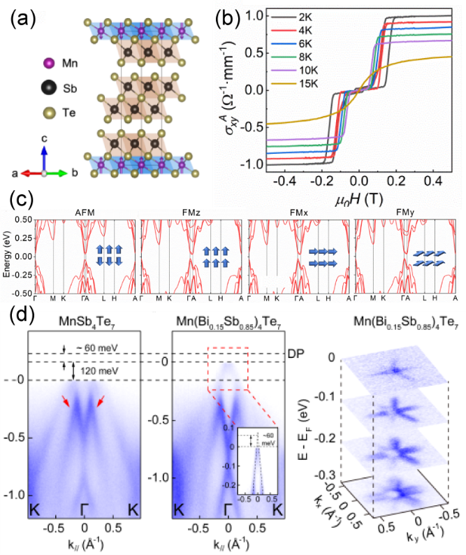 一些磁性材料中,磁结构和自旋方向能够被外磁场所调控,当自旋轨道耦合较强时,自旋结构能够有效传递给电子,进而导致电子结构相变。这种外磁场可控的电子结构变化为设计灵活可控自旋电子学器件提供了便利。例如,近年来新发现的内禀反铁磁拓扑绝缘体MnBi2Te4(Bi2Te3)n中的量子反常霍尔效应态和轴子绝缘态就引起了研究人员的广泛关注。
