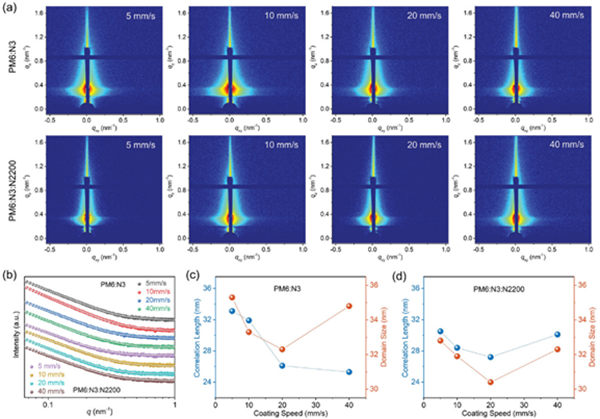 当前位置:首页 > 科学研究 > 研究亮点解决能源短缺和环境污染问题的一个理想策略就是开发和利用太阳能。有机太阳能电池(OSC)具有重量轻、溶液加工成本低、可印刷、可制备成柔性器件等优点而备受关注。目前,得益于非富勒烯受体的快速发展,OSC的最高光电转换效率(PCE)已突破19%。然而,这些高效率的OSC都是通过旋涂法制备的,很难推广应用到大面积太阳能电池的制备。相对于旋涂,刮刀涂布是卷对卷印刷工艺的原型工具,可以实现有机太阳能电池的大面积制备。但是,由于OSC体相异质结形貌的形成,是一个秒级时间尺度下的动态演变的过程。伴随着刮涂液相成膜,溶剂的挥发将诱导给/受体相分离、成核、结晶以及分子构象改变等,最终形成复杂的多尺度微观结构。由于对刮涂过程中溶液剪切效应缺乏深入了解,刮涂器件的PCE滞后于旋涂器件。因此,迫切需要采用多方法结合技术,原位实时研究OSC形貌动态演变过程和成膜机制。