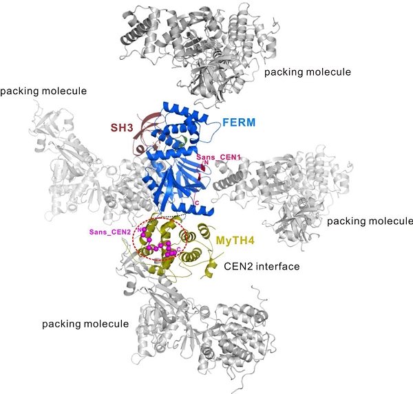 张明杰教授及他的研究团队,利用在上海光源生物大分子晶体学线站BL17U采集的晶体X光衍射数据,成功解析了肌动蛋白7a与Sans(另外一种可导致Usher综合症的蛋白质,其功能主要是充当桥连蛋白,将肌动蛋白7a的运输物体与其链接在一起)蛋白质复合物2.8埃分辨晶体结构。结合核磁共振技术得到的结果,解释了肌动蛋白7a在不同细胞中是如何进行运输,也解释了其在内耳细胞中是如何维持耳毛细胞结构的。