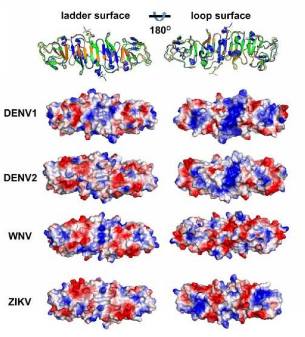图:寨卡病毒NS1与其它黄病毒NS1结构比较,揭示了不同黄病毒NS1存在不同的表面电荷分布特征