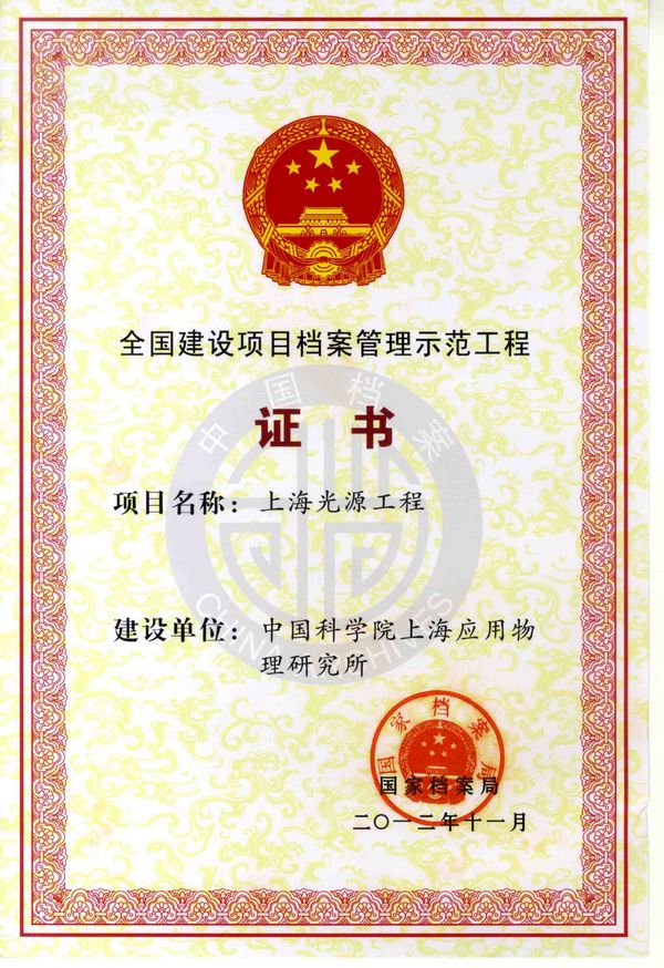 2013年6月14日,国家档案局在京召开了“全国建设项目档案管理示范工程”经验交流会。“全国建设项目档案管理示范工程”创建活动于去年首次开展,我所承建的“上海光源工程”由中国科学院推荐申报并顺利当选,成为中国科学院院属机构中唯一被推荐并获此殊荣的单位。