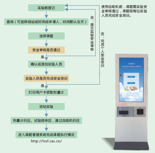 上海光源用户实验自助系统终端机位于上海光源南门门卫室(张衡路239号),用户抵达光源后通过实验自助终端机查询本次实验课题信息,确认(或添加)实验人员信息,打印用户卡片并领取个人辐射剂量计,再从门卫处领取门禁卡,即可直接进入实验大厅进行实验。实验结束后,实验人员将个人辐射剂量计归还至用户实验自助终端机,然后通过http://lssf.cas.cn填写本次实验的课题执行情况表,即完成了本次实验的全部内容。