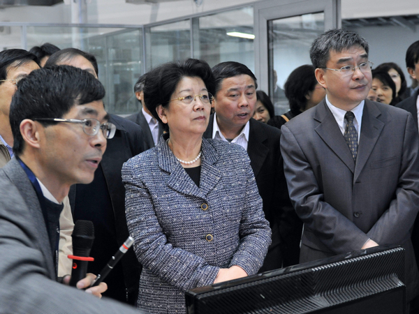 陈至立一行听取了上海应用物理所所长、党委书记赵振堂关于上海光源工程总体情况的汇报,并实地察看了上海光源主体模型、电子储存环、光束线实验站等科学设施。