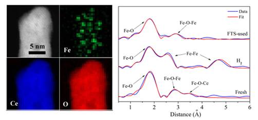 由于高比例的暴露的界面活性位点,亚纳米团簇催化剂往往表现出较普通纳米尺寸的催化剂更为优越的催化活性。以往有关亚纳米催化剂的研究涉及的大多为贵金属相关的原子或团簇级催化剂的构建,而对于活性较高且更为经济适用的过渡金属催化剂的研究相对空白。此外,在能源催化领域中至关重要的费托合成反应(CO+H2→(CH)x+H2O)中,由于催化剂结构的复杂和反应条件的苛刻,费托合成催化剂的构效关系一直是研究的难点。针对以上问题,司锐研究员于贾春江教授、马超博士等三个课题组紧密合作,充分利用二氧化铈负载的亚纳米级铁氧团簇的结构单一性,使用同步辐射X射线吸收精细结构谱(XAFS)和球差矫正的高分辨透射电子显微镜(Cs-corrected HRETM)结合电子能量损失谱(EELS)深入系统考察了Fe-Ox-Fe团簇和Fe-Ox-Ce团簇催化剂在费托合成反应的结构演变的过程。结合对不同反应时间下Fe原子的电子结构及短程配位信息(Fe-O、Fe-Fe及Fe-Ce)的考察,推测并验证出,有弱相互作用力的Fe-O-Fe团簇在催化费托合成的反应中具有更为优越的性能。该工作发展了对于在原子层次考察负载型催化剂的结构变化及构效关系提供重要的实验方法,对于其他类似催化剂体系的精细结构表征也具有指导意义。三位评审者对本工作给予了充分肯定,其中两位审稿专家给予领域内Top10%的高度评价。