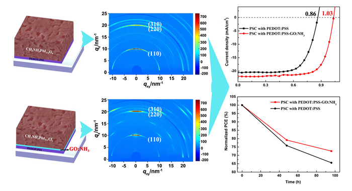 通过传输层来进行界面工程以提高器件效率是钙钛矿太阳能电池的重要研究方向,上海应用物理研究所高兴宇、杨迎国、冯尚蕾等研究人员在与孙宝全教授课题组前期合作工作的基础上(Nanoscale,Zhongwei Wu etal. DOI:10.1039/C4NR03181D),以氧化石墨烯(GO)作为电荷传输层,通过引入氨基调控氧化石墨烯,优化钙钛矿薄膜生长界面的电子结构,同时改善薄膜的结晶性和晶面择优生长取向,大幅提升钙钛矿薄膜的结构稳定性和器件性能(转换效率由12%提升至16.13%)。该工作同时得到了苏州大学廖良生课题组和上海应用物理研究所李景烨课题组的帮助,相关结果发表在ACS Applied Materials & Interfaces(Shanglei Feng, Yingguo Yang, Meng Li, etal.DOI:10.1021/acsami.6b02064)上。