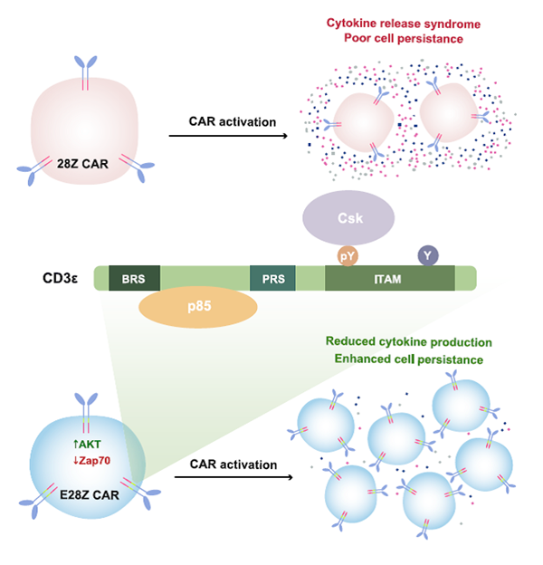 CAR-T细胞治疗已经成功地应用于肿瘤的临床治疗,但面临细胞因子释放综合症和细胞持续性低等挑战。CAR的信号元件来自抗原受体TCR的CD3ζ链以及共刺激分子如CD28。目前对CAR的改造主要集中在共刺激信号元件,而忽视了抗原信号元件。