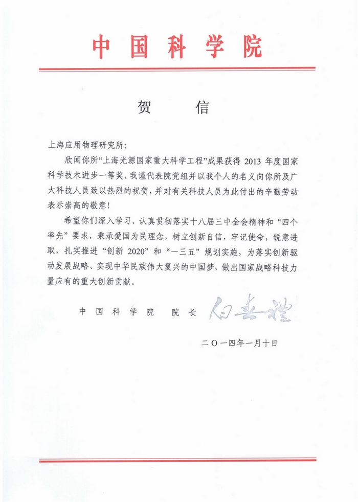 日前,中国科学院院长、党组书记白春礼给上海应物所发来贺信,对“上海光源国家重大科学工程”荣获2013年国家科学技术进步一等奖表示祝贺。