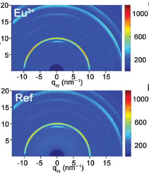 钙钛矿太阳能电池是广受关注的新一代光伏技术,而其工作稳定性是目前产业化的主要障碍。由于卤化铅钙钛矿的“软”的性质,使它在制备和处于工作阶段时,极易产生本征缺陷零价铅(Pb0)和碘(I0),这一问题严重制约着器件长期稳定性。为提高本征稳定性,北京大学周欢萍研究组、严纯华/孙聆东研究组及其合作者提出,通过在钙钛矿活性层中引入铕离子对作为“氧化还原梭”,可同时消除相关缺陷,进而大幅提升器件使用寿命。研究团队利用上海光源BL14B线站的掠入射广角X射线散射证实,Eu3+-Eu2+离子对在钙钛矿多晶膜内部的氧化还原穿梭不仅可以有效减少多晶膜的本征缺陷,而且也未引起明显的晶面择优取向的变化,很好的保持了薄膜原始的高度有序结晶度。