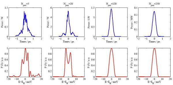 中等能量X射线自由电子激光振荡器输出辐射脉冲特性,蓝色为时域结构、红色为频域结构。X射线从噪声起振以后,经过高单色性布拉格谐振腔的筛选,逐渐演变为时间空间全相干的MW量级辐射。