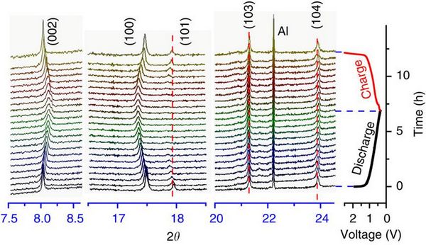 图3. 化学钠化过程中P2-Na0.66[Li0.22Ti0.78]O2材料的结构变化:同步辐射原位XRD图谱