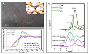 为了从原子水平上认识了催化剂单铁中心活性位的结构、自由基表面引发和气相偶联生成产物的反应机制,进而揭示单铁活性中心抑制甲烷深度活化从而避免积碳的机理,该课题组在上海光源BL14W1线站针对纳米0.5% Fe@SiO2体系开展了原位XAFS实验。数据分析表明在催化剂活化前,具有明显的Fe-O配位,而在催化剂活化后,变为 Fe-C以及Fe-Si配位。这个结果充分说明在催化剂高温活化过程中Fe原子从铁氧化物纳米颗粒的形态中脱离嵌入进SiO2晶格形成了单原子的分布。这也进一步说明该催化剂的性能来源于不饱和配位Fe原子的高活性。