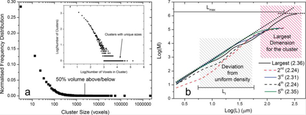 图2: 集群统计:(a)铬酸锶群的频度分布;(b) 五个最大铬酸锶群质量与尺度的分布(分形维数).