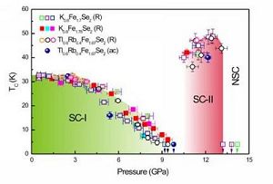 2010年发现的新型铁基硫族化合物超导体A1 - xFe2 - ySe2(其中 A = K, Rb 或 Cs, 及部分替代的Tl)为非常规超导体的研究探索开辟了新的研究方向和提供了新的机遇。这类超导体在常压下的超导转变温度约为32K,中子散射研究结果表明,这类超导样品具有很强的反铁磁磁距并在铁离子的正方型格子中存在铁离子有规律的缺位。为何这样高TC的超导电性能够在如此强的磁背景中存在,以及反铁磁和铁离子有规律的空位如何对超导电性产生影响等问题倍受关注。大量的理论和实验研究结果表明,对于关联电子系统中的超导电性是由其晶体结构、电荷、轨道和自旋的状态及其相互作用所决定的,而这些因素对超导电性的影响可以通过外部参数的改变,如施加压力、磁场等进行调控。其中,压力是一种“干净”和有效的调控方法,它的独特之处在于不用改变研究系统的化学构成就能实现对系统的电子结构和晶体结构及其相关合作现象的有效调控,从而揭示其内在的物理机制。比如,利用压力手段可以改变电子密度、电子轨道的杂化和磁性能等,由此导致许多重要物理现象,如金属——绝缘体相变、价态变化、超导相的出现等。