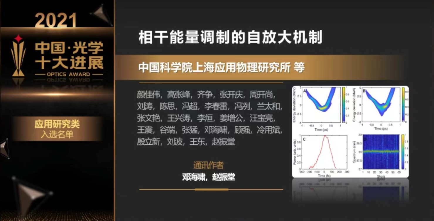 5月23日,中国激光杂志社在线发布“2021年度中国光学十大进展”。冰光纤、小型化自由电子激光等十项基础研究,六维光信息复用、能降温的光学超材料织物等十项应用研究成功入选“2021年中国光学十大进展”。其中,上海光源科学中心团队的研究成果——“相干能量调制的自放大机制”入选应用研究类的十大进展,此项研究由中国科学院上海应用物理研究所和中国科学院上海高等研究院联合完成。
