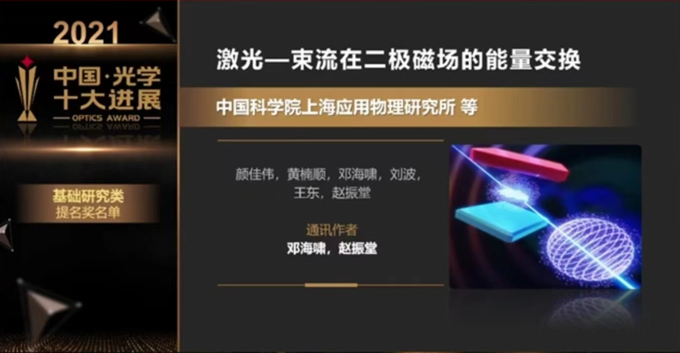 中国光学十大进展由中国激光杂志社发起,经过评审委员会多轮遴选,最终20项优秀光学成果从162项研究进展中脱颖而出,入选2021年度中国光学十大进展(基础研究类与应用研究类各10项)。据悉,这是上海光源中心继2012年“回声谐波型自由电子激光的首次受激放大”之后再次入选中国光学十大进展。同时,上海光源中心的“激光-束流在二极磁场的能量交换”成果入选2021年度中国光学十大进展基础研究类提名奖。