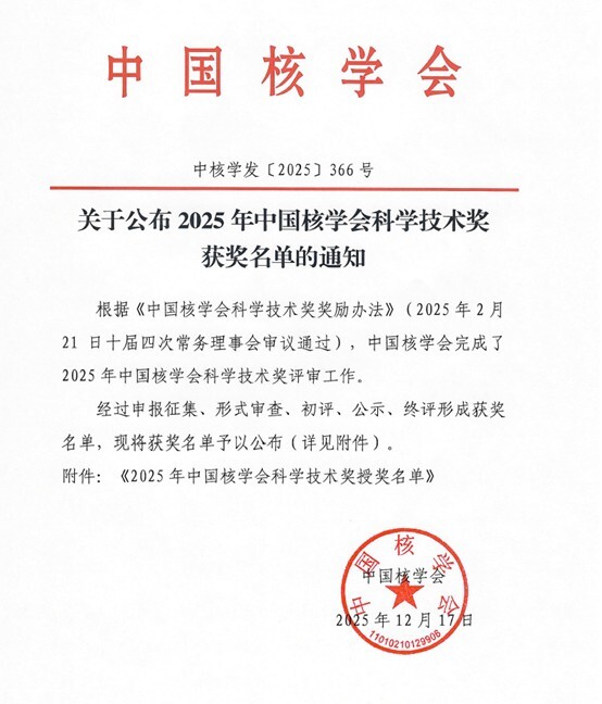 据悉,中国核学会科学技术奖由中国核学会组织,是核科技领域具有重要权威性的奖项。其中自然科学奖聚焦核科技领域阐明自然现象、特征和规律的重大科学发现,其一等奖对应“取得重要科学发现,对核科技相关学科发展有重要推动作用或为相关技术突破提供重要理论基础”的核心标准,是对基础研究成果的高度认可。