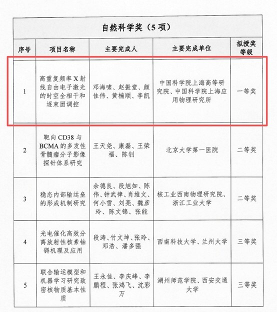近日,中国核学会公布2025年中国核学会科学技术奖获奖名单,由中国科学院上海高等研究院(以下简称“上海高研院”)、中国科学院上海应用物理研究所共同完成的“高重复频率X射线自由电子激光的时空全相干和逐束团调控”项目,荣获自然科学奖一等奖。上海高研院邓海啸研究员、赵振堂院士等为该项目主要完成人。