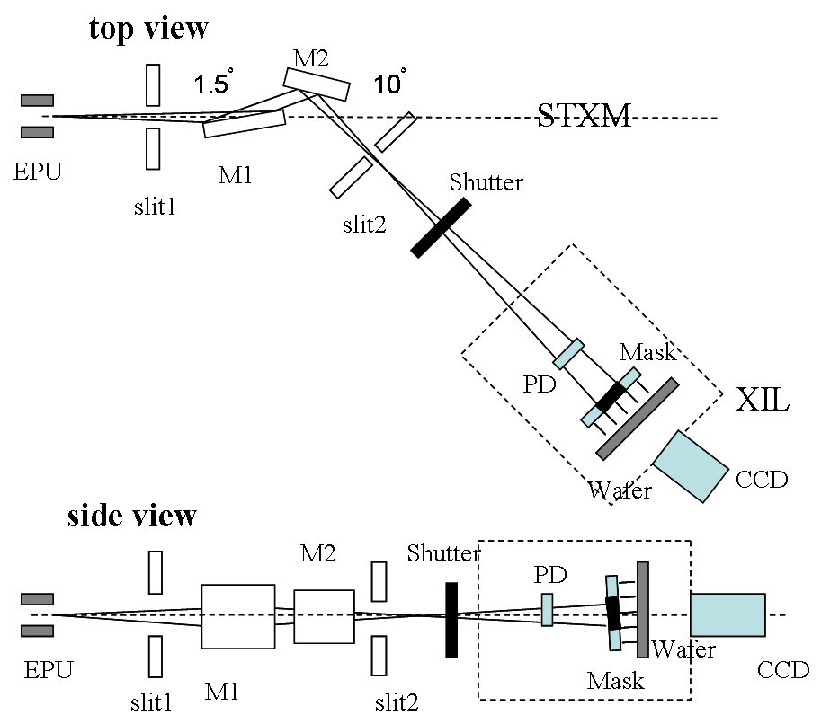 软X射线干涉光刻线站(BL08U1B)是原有软X扫描投射显微谱学线站(BL08U1A)的分支线,二者共用同一前端区和光源。下图为XIL分支光束线光学布局示意图。它由插入式光束偏转系统、精密狭缝系统及超高真空系统组成。该束线将工作于光栅分束衍射XIL模式。