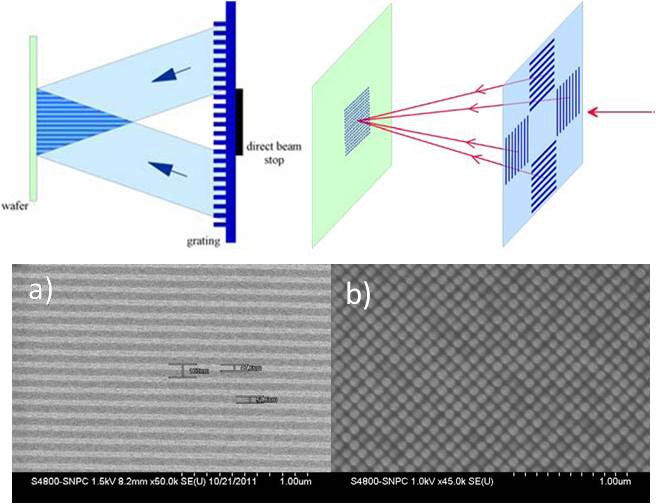 两光栅/多光栅干涉:主要在光刻胶上获得一维线性周期结构和二维周期点阵或孔洞结构,目前可实现的图形周期范围70nm-1000nm;
