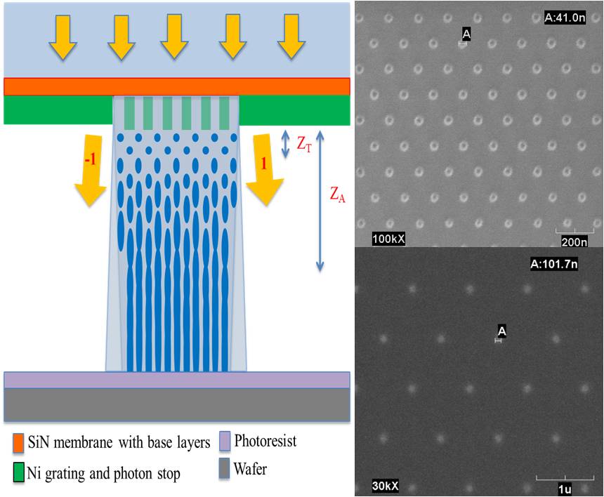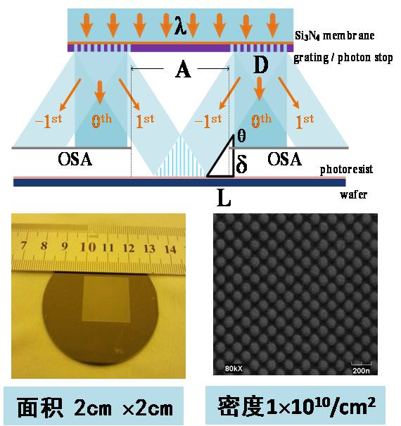 宽带泰保光刻技术:利用光栅的自成像效应,我们在XIL已实现宽带泰保光刻, 目前可实现的二维图形周期范围70nm-1000nm;图形占空比最小可达1:10。