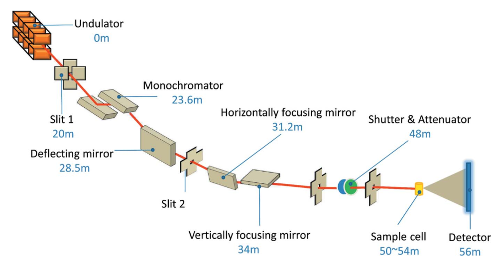 BioSAXS的关键是获得高质量的入射x光。高亮度是减小样品用量和进行时间分辨测量的保证,而低散射角的测量则要求入射光有良好的平行度,因此需要利用波荡器产生低发散度的x光。根据实验需求,BL19U2线站光束线部分主要由单色器、水平偏转镜、水平聚焦境、垂直聚焦境、真空精密狭缝、位置探测器、辐射阻挡器、光闸、真空系统、光学棚屋等和水电气等公用设施组成。